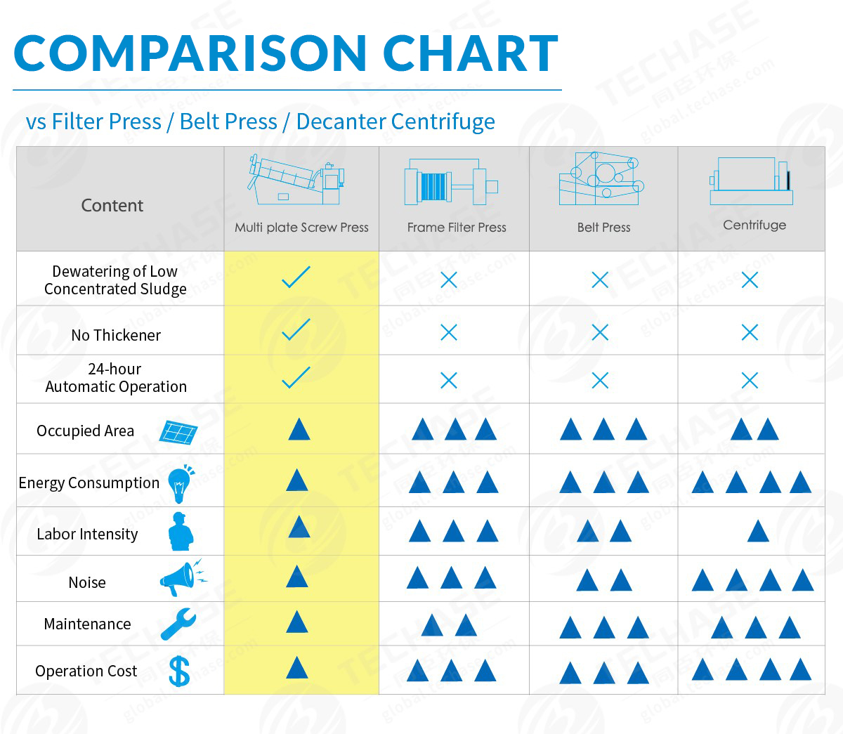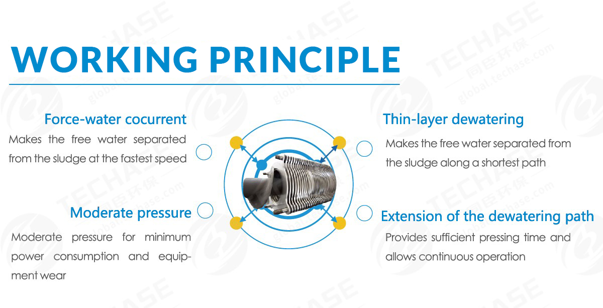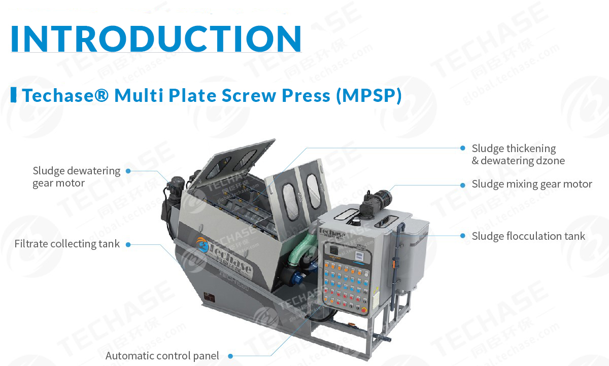 Under the cooperation with Tongji University, TECHASE start-up team successfully developed a new generation sludge dewatering technology – Techase® Multi Plate Screw Press, a brand-new screw type sludge dewatering equipment which has been proven much more advanced in every aspect than conventional traditional sludge dewatering machines including belt filter press, decanter centrifuge, plate-and-frame filter press, screw filter etc. It is outstanding by all-in-one compact design, clogging-free, high automation level, wide range of applications, low energy consumption, simple operation & maintenance, no backwash water. During past 15 years, as the largest manufacturer, Techase has got 40+ patents and exported to 109 countries all over the world.